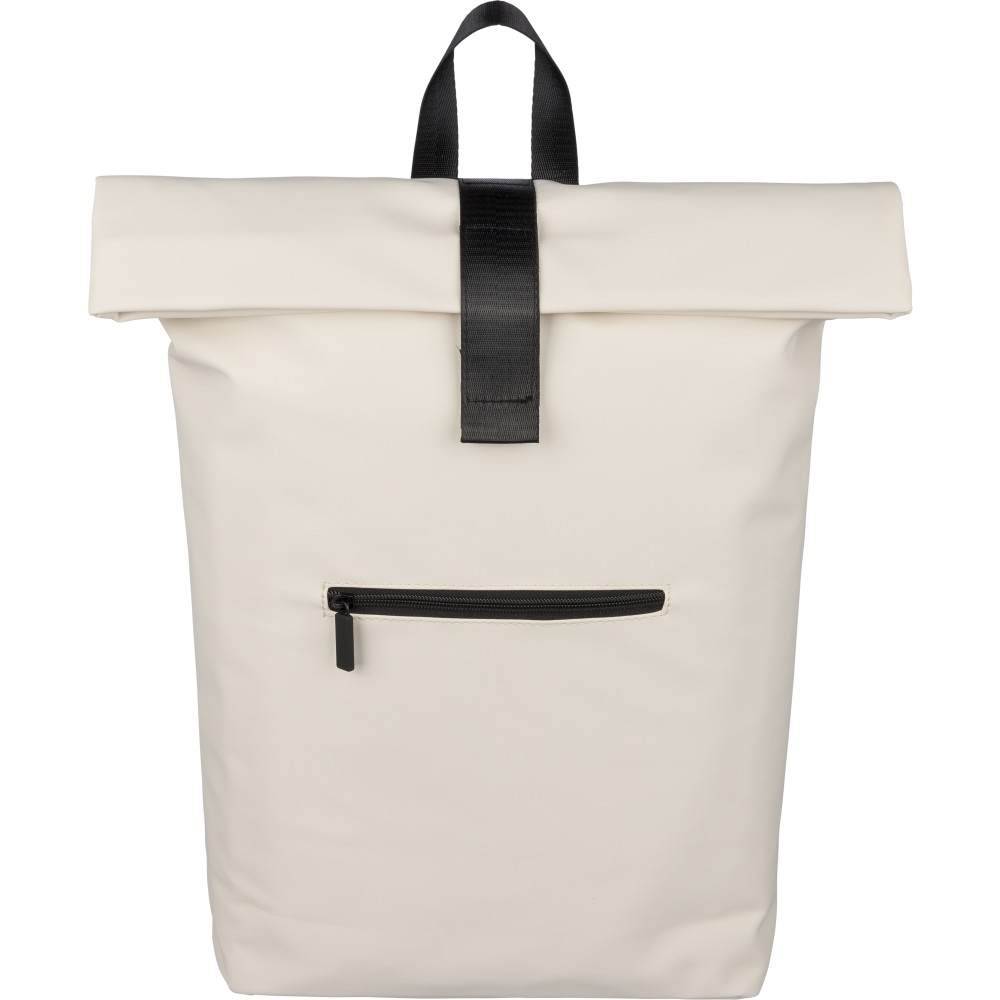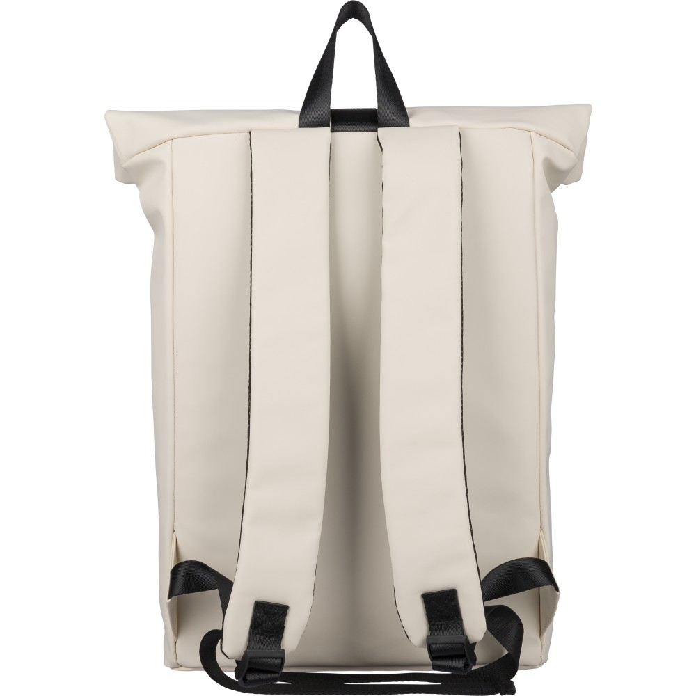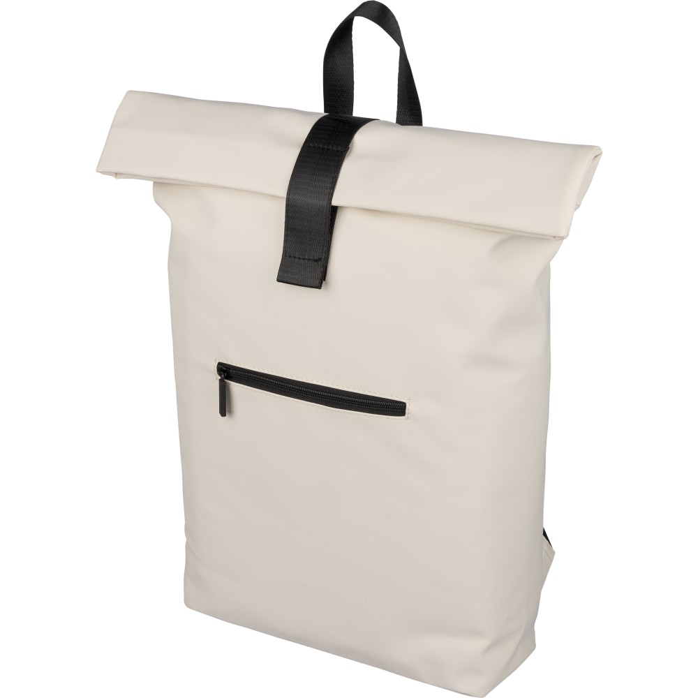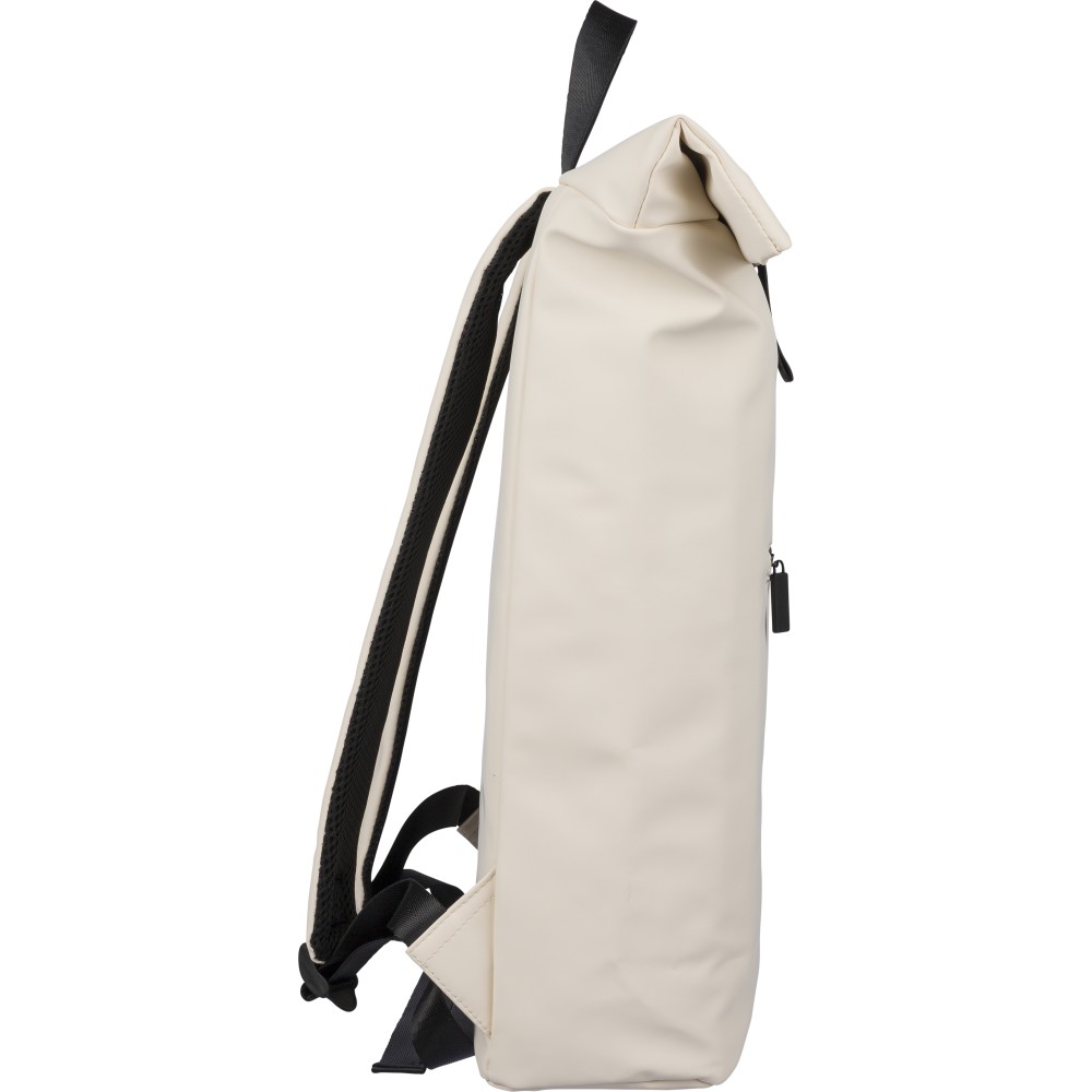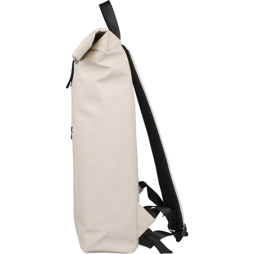Újrahasznosított PU anyagból készült hátizsák 19 literes űrtartalommal, rolltop záródással és tépőzáras rögzítéssel. Elülső cipzáras zsebbel, 16 hüvelykes laptoprekesszel, 210D újrahasznosított béléssel, állítható szellőző vállpántokkal és felső fogantyúval rendelkezik. A belső címkén újrahasznosított alapanyagra utaló jelölés található.