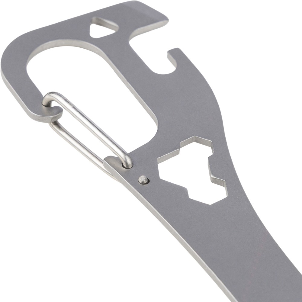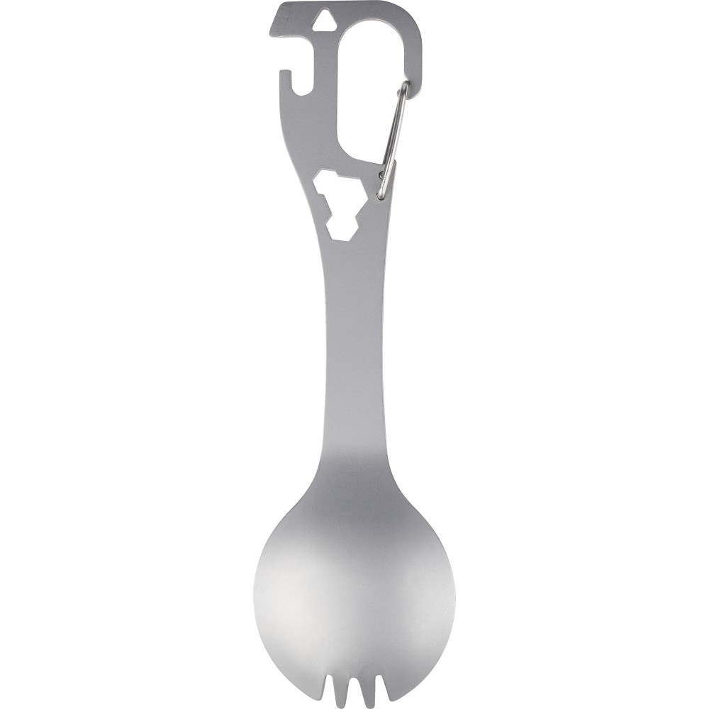 Rozsdamentes acélból készült spork (kanál - villa kombináció) integrált villával és kanállal, valamint beépített lapos csavarhúzóval, üveg- és konzervnyitóval, továbbá három hatlapú kulccsal a nyélben. Karabinerrel ellátva. Darabonként papírtasakba csomagolva.