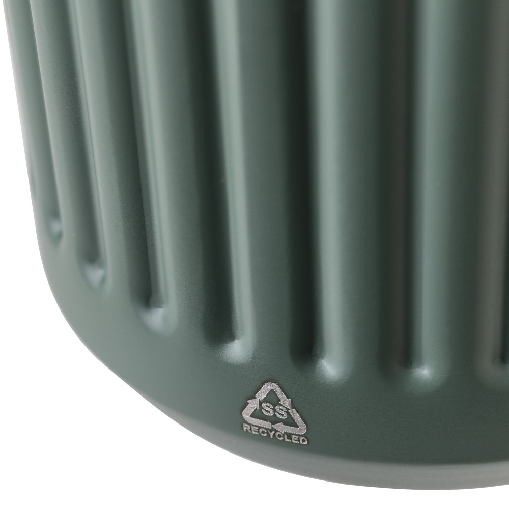 Újrahasznosított rozsdamentes acélból készült utazópohár 400 ml űrtartalommal, duplafalú kialakítással és külső bordázott felülettel. Belső része 304-es, külső része 201-es rozsdamentes acél, PP fedéllel. A pohártesten gravírozott recycled (újrahasznosított) alapanyagra utaló logó található. Darabonként barna kartondobozba csomagolva.