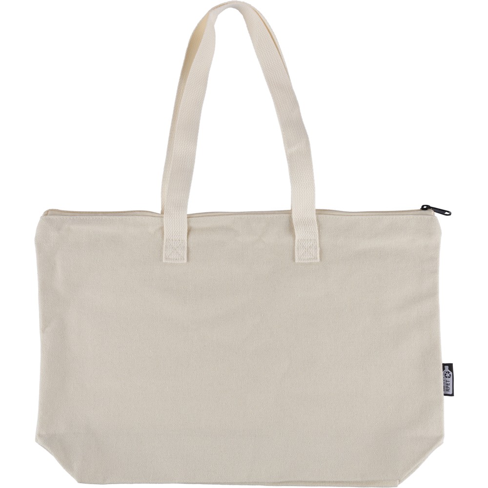 Újrahasznosított pamut-poliészter, 330 g/m2 kevertszövetből készült bevásárlótáska nagy, cipzáras felső rekesszel, 65 cm hosszúságú és 2,5 cm szélességű hosszú fülekkel, a táska színével harmonizáló hevederrel. Külső felületén rPET címkével, belső részén további címkével ellátva.
