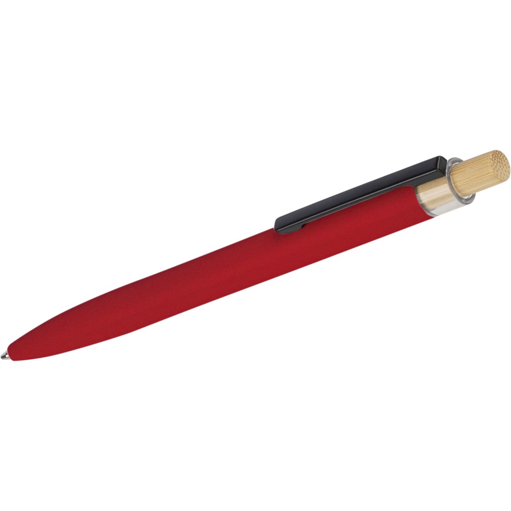 Újrahasznosított alumíniumból készült, lakkozott, nyomógombos golyóstoll bambusz nyomógombbal, rPET díszítéssel és fém klippel. A tolltesten gravírozott recycled (újrahasznosított) alapanyagra utaló logó található. Megközelítőleg 700 méter íráshossz, kék tollbetéttel.