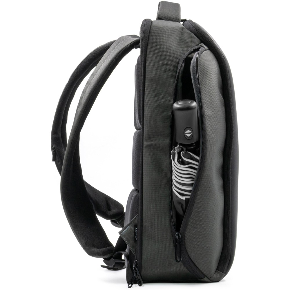 800D hátizsák víz- és szennyeződéslepergető újrahasznosított, nagy kopásállóságú, ballisztikus szövetből, vegán bőr elemekkel. 22 literes űrtartalommal rendelkezik, párnázott rekesszel legfeljebb 16 hüvelykes laptophoz. Hátsó lopásgátló rekesszel, integrált szemüvegtartó rekesszel, két oldalsó tárolóval és bőröndre rögzíthető pánttal kialakítva. Puha tapintású, szellőző hátpárnázással ellátva, mindennapi használatra vagy utazáshoz alkalmas.