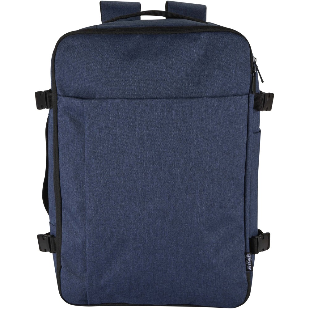 GRS tanúsítvánnyal rendelkező újrahasznosított poliészterből készült, RPET béléssel ellátott Libra hátizsák, melynek méretei megfelelnek a légitársaságok kézipoggyászra vonatkozó előírásainak. A táska egy dedikált, legfeljebb 17" méretű eszközök fogadására alkalmas laptoptartó rekesszel, valamint egy tágas főrésszel rendelkezik, amelyben rugalmas pántok és hálós elválasztók biztosítják a tartalom rendezettségét. Az elülső oldalon két nagyméretű cipzáras zseb található az alapvető kellékek gyors eléréséhez. A kényelmes viseletről és a praktikus szállításról légáteresztő hátpanel, bőröndre rögzíthető pánt, állítható vállpántok, mellkaspánt, valamint felső és oldalsó hordozófogantyúk gondoskodnak. Letisztult megjelenése és funkcionális kialakítása miatt kiváló választás üzleti utakhoz vagy irodán kívüli munkavégzéshez, miközben alapanyaga az öko-tudatosságot tükrözi.