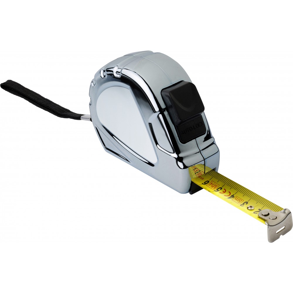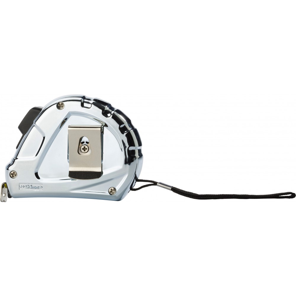 5 méteres mérőszalag centiméter beosztással, fényes házzal, övcsattal, csuklópánttal.